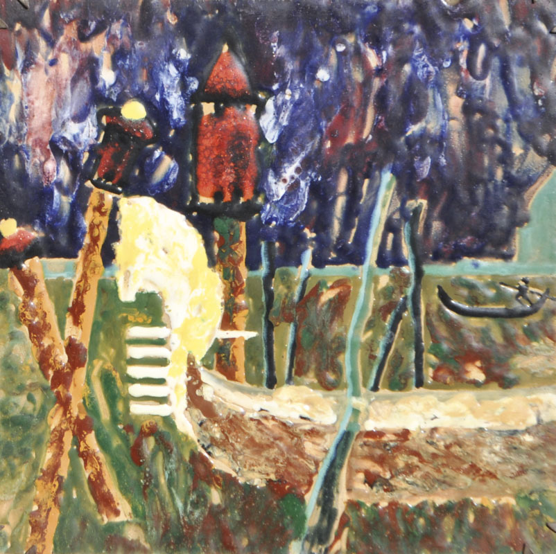 Pittura a terzo fuoco su piastrella in ceramica, 20 x 20 cm, al retro etichetta ‘Ivanhoe Gambini pittore ceramista’
