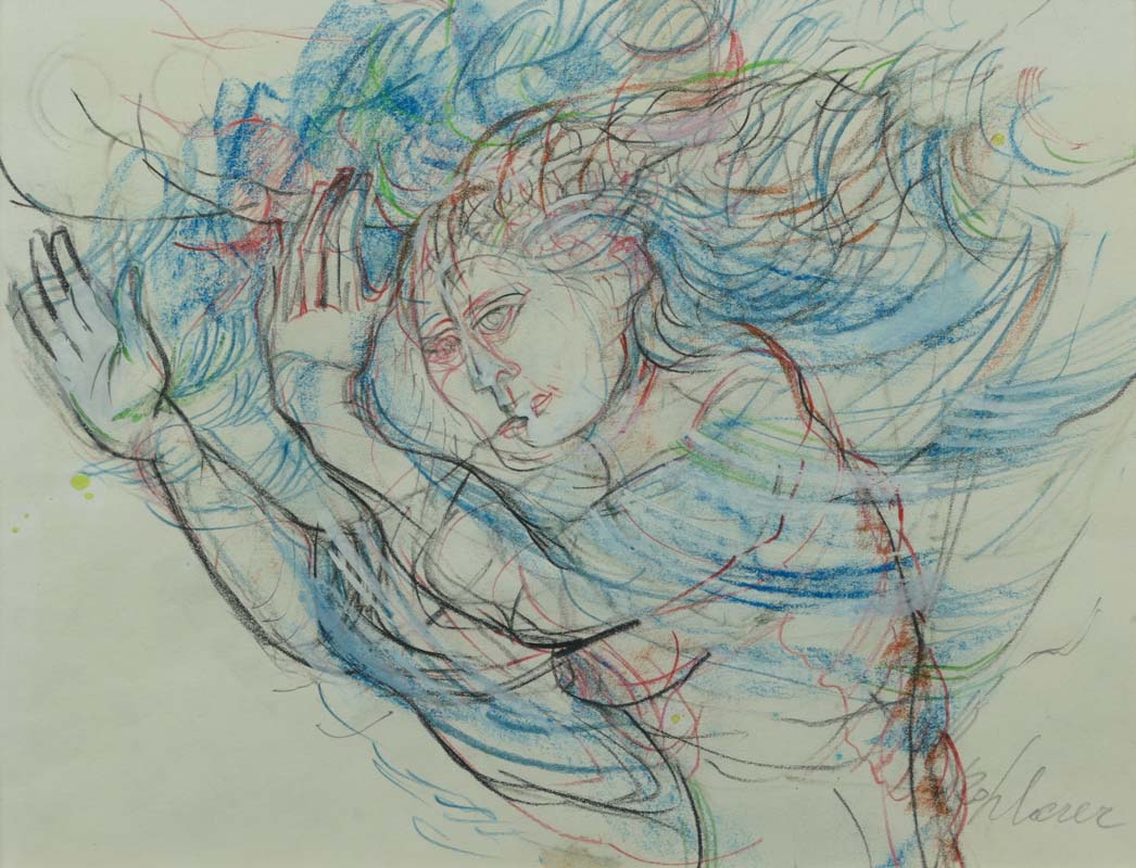 Matite colorate su carta, 20 x 26 cm, in cornice. Firma