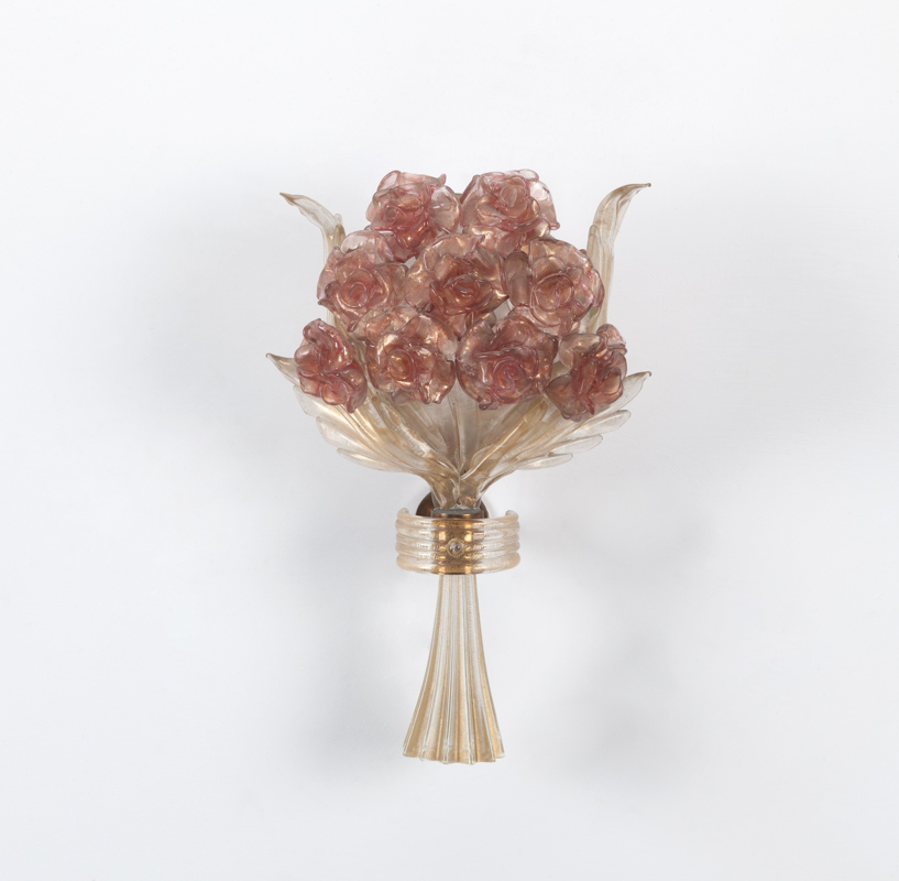A copri luce “a mazzo di rose”, in vetro color rosa e finale in vetro dorato, H. ca. 31 cm, larghezza 16 cm, impianto elettrico da rifare