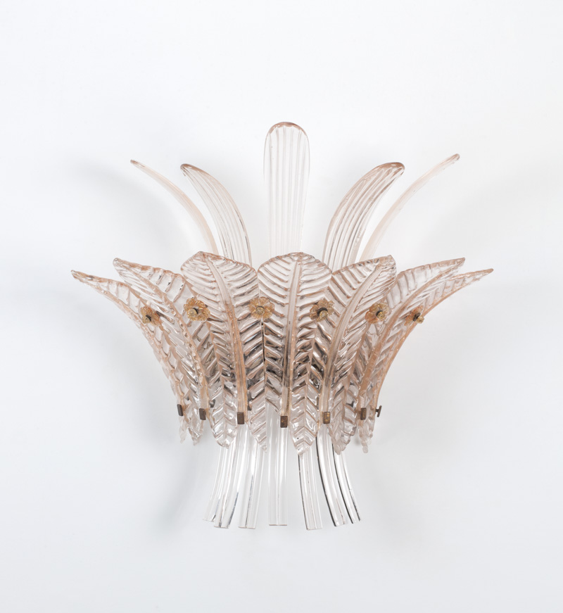 A doppio giro di foglie in vetro rosa, fermi a forma di fiore in vetro/oro, H. 50 cm, larghezza 40 cm, sporgenza 20 cm, piccola mancanza ad una foglia, impianto elettrico da rifare